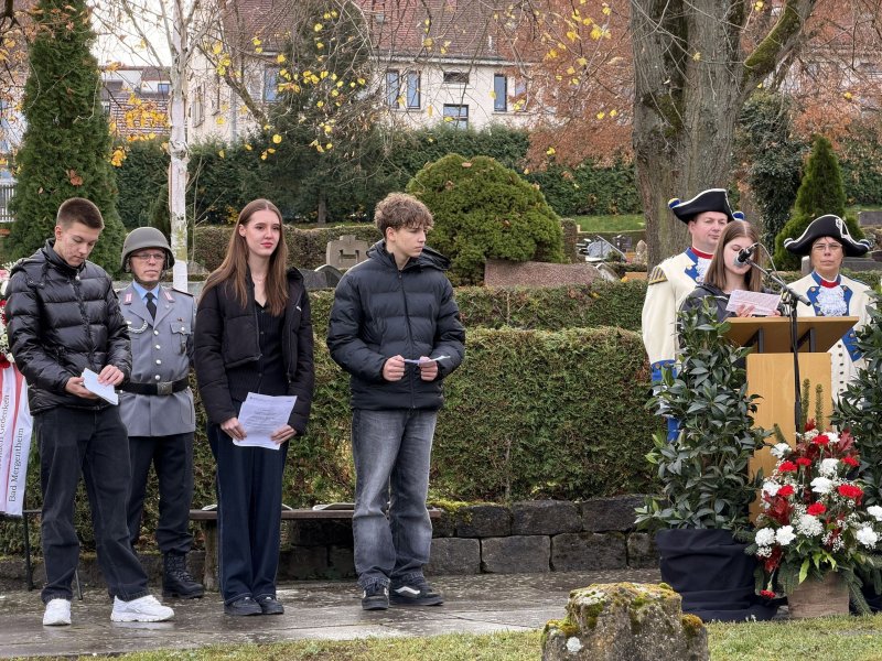 Mitwirkende bei der Zentralen Gedenkveranstaltung auf dem Alten Friedhof in Bad Mergentheim waren die Schülervertretung der Kopernikus-Realschule, die Stadtkapelle, der Sängerkranz Harmonie, die Reservistenkameradschaft, die Historische Deutschorden-Compagnie, der VdK und der Volksbund Deutsche Kriegsgräberfürsorge.